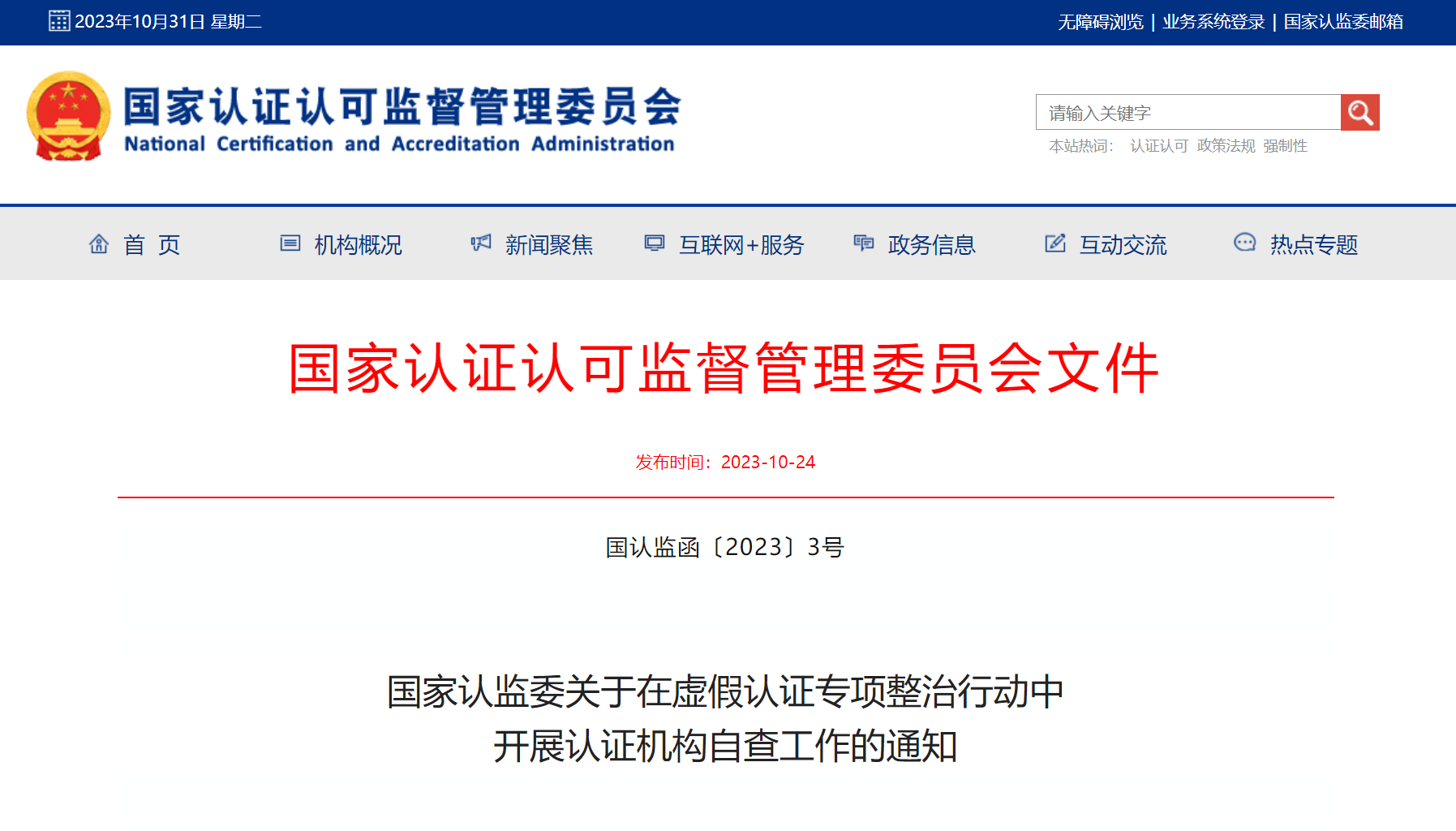 請各獲證組織按照認證的相關要求立即著手開展自查工作,并于2023年11月10日前完成。