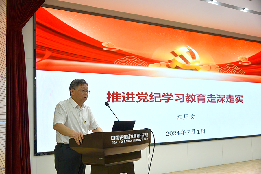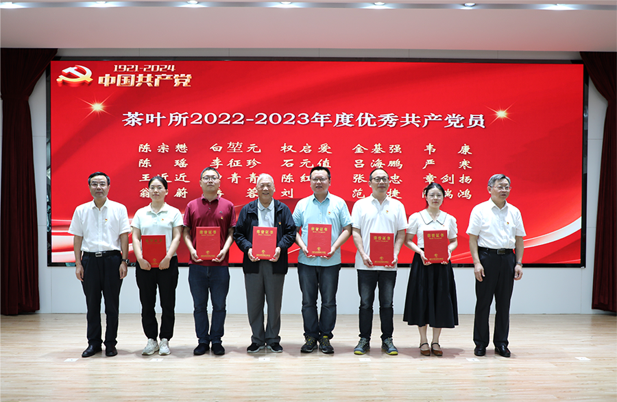 表彰儀式上,黨委委員任淑敏同志通報了2023年度研究所、部門(團隊)、個人獲上級榮譽表彰情況,黨委委員姚明哲同志宣讀了茶葉所2022-2023年度“兩優一先”表彰決定,所長姜仁華、黨委書記江用文共同為獲獎代表頒獎。最后,6名新黨員以及全體與會黨員面向黨旗宣誓,集體重溫了入黨誓詞。