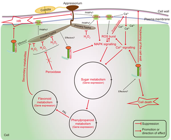 團隊前期研究發現,炭疽菌Colletotrichum fructicola是我國茶樹炭疽病主要優勢種之一(Scientific Reports, 2016, 6:35287)。利用遺傳背景相近的龍井43(易感病)和中茶108(強抗病)品種作為供試材料,分別對接種炭疽菌后24小時和72 小時的葉片組織進行轉錄組測序分析,發現抗病品種差異表達基因顯著富集在過敏性壞死(HR)和活性氧代謝通路,而感病品種中的相應同源基因并未富集此通路;通過組織化學染色技術,發現抗病品種在接種 24 小時出現 HR 反應并伴有細胞壁加厚,而感病品種僅出現葉肉細胞壞死;兩個品種葉片均出現不同程度的H2O2 積累,但抗病品種比感病品種提前 24 小時響應,并且抗病品種葉片的反應程度比感病品種劇烈,進一步驗證了轉錄組實驗結果。這說明過敏性壞死和活性氧代謝是茶樹抵御炭疽菌侵染的重要手段。另外,通過蛋白互作網絡分析,發現抗性品種特異性差異表達基因可相互作用,其中抗病基因激活MAPK級聯反應并調控下游包括次級代謝物合成在內的多種抗性反應。