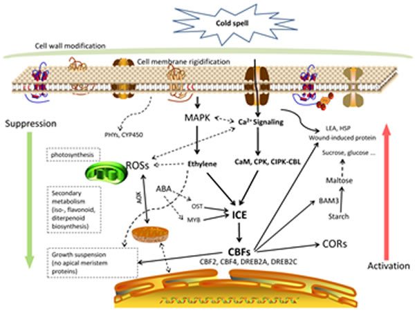 研究利用人工模擬“倒春寒”條件,分析了茶樹新梢萌發至魚葉期、一芽一葉期和一芽二葉期不同發育階段的轉錄組和代謝組變化,證實MAPK介導的乙烯信號和鈣離子信號是茶樹新梢響應“倒春寒”的兩個主要早期信號途徑,隨后低溫響應信號途徑ICE-CBF-COR被激活,引起一系列的生理代謝改變。其中,低溫脅迫條件下,新梢的生長、光合、次生代謝(主要為多酚生物合成)受到明顯抑制,而抗凍蛋白積累以及以淀粉代謝為主的糖代謝的顯著增強可能是新梢應對低溫脅迫的主要機制。以上信號通路中重要基因的表達及代謝物含量的變化在自然“倒春寒”條件下的茶樹新稍中也得到驗證。該研究結果將為全面揭示茶樹新梢抗寒機理和生產中解決“倒春寒”問題提供重要理論依據。