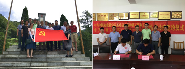支部黨員一行首先來到婺源縣大鄣山鄉鄣山村。在大鄣山鄉黨委書記戴有彬的主持下,我所種植基地辦黨支部和鄣山村黨支部簽訂了結對共建協議。鄣山村是當年由關英、倪南山、劉毓標等領導的皖贛紅軍獨立團開展游擊戰爭并建立大鄣山革命根據地的地方,同時也是中共皖浙贛省委第一次擴大會議召開之處。會上,鄣山村汪飛書記還向我們介紹了鄣山村特色茶歷史等方面的工作。雙方希望通過支部結對共建的形式,發揮種植基地辦技術和人才優勢,搭建服務平臺,進一步引導支部廣大黨員深入基層,服務大鄣山鄉茶產業發展,助力地方政府精準扶貧,推動茶農增收致富。我所選派服務婺源縣的中組部第18批博士服務團成員、婺源縣委常委副縣長付建玉同志,大鄣山鄉黨委書記戴有彬、鄉長張茂泉等人參加了此次活動。