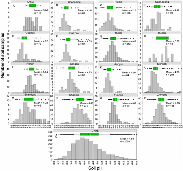 茶樹是喜酸作物,其最適宜的土壤pH值為4.5-5.5,但在強酸性土壤環境(土壤pH<4.5)下,茶樹養分吸收受到限制,影響茶樹生長和茶葉品質,同時茶樹對鉛等重金屬元素吸收量顯著提高,從而造成安全隱患。因此,掌握我國茶園土壤酸化現狀,可為未來我國茶園土壤酸化分類調控對策的制訂和重點區域土壤酸化的阻控提供依據。