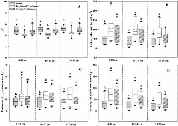 此外,我們對有機茶園、常規茶園和附近林地土壤pH值和交換性酸進行了比較(圖3)。與森林土壤相比,常規茶園各土層土壤pH值顯著下降,但是有機管理方式下茶園土壤pH值并沒有出現顯著下降。同時常規茶園各土層土壤交換性酸含量顯著高于森林土壤和有機茶園土壤。這些結果都說明采用有機管理方式是防治茶園土壤酸化的一個重要措施。