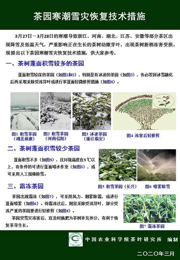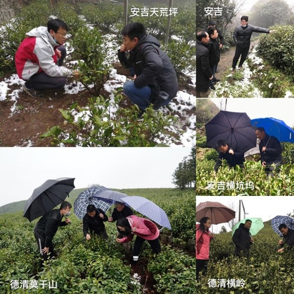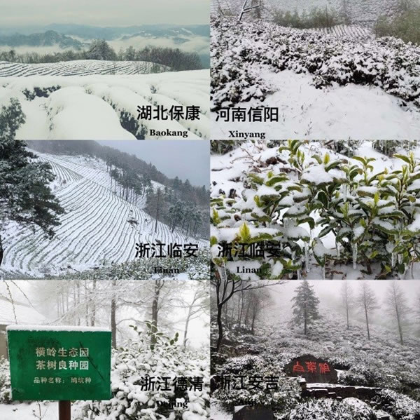 28日上午種植中心有關專家分頭了解了河南、湖北、江蘇和浙江重點區域的降雪情況,并就本次寒潮降雪對春茶生產可能造成的影響及時進行研判,迅速編制了《茶園寒潮雪災恢復技術措施》掛圖,第一時間通過中國茶葉學會微信平臺發布,截至目前點擊量已破萬次。28日下午和29日,中心分別派出專家到安吉天荒坪和德清橫嶺茶場實地察看雪情和茶芽受凍情況,指導茶農、茶企科學應對本次寒潮降雪。