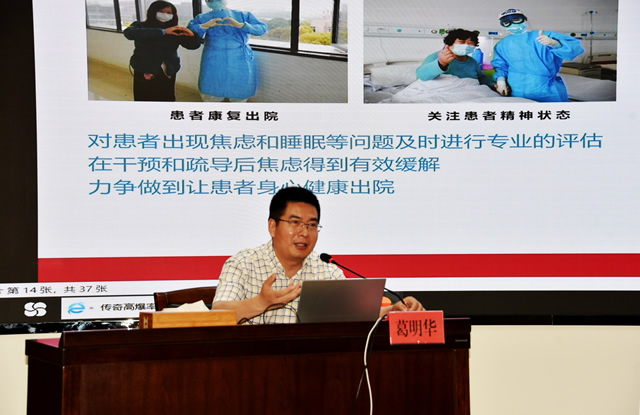 葛明華院長以“2020 我們在武漢45天”為題,從“救治患者是使命、保護戰友是根本、科技攻關是必須、弘揚正氣亦擔當”四個方面生動地講述了援鄂醫療隊在武漢45天抗疫歷程,讓廣大職工、研究生更加直觀生動地了解了抗疫一線戰“疫”降“魔”、愛國奉獻、服務人民的感人場景,讓與會人員接受了一次很好的精神洗禮。