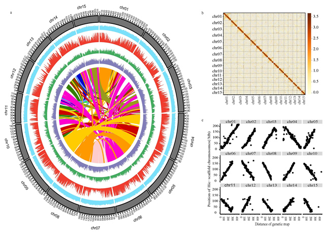 茶樹(Camellia sinensis [L.] O. Kuntze)起源于中國而風靡于世界,世界茶飲料消費人口已超過三分之二。茶樹在我國分布廣泛,種質資源豐富,六大茶類各具特色,而有關茶樹進化的研究尚少。研究團隊首先以我國著名的優良茶樹品種‘龍井43’(C. sinensis var. sinensis cv. Longjing 43)為材料,利用研究團隊自主開發的三代組裝軟件結合高通量染色體構象捕獲(Hi-C)等技術,克服了其基因組高度雜合、重復序列比例高等復雜基因組組裝難題,完成了‘龍井43’染色體級別的基因組組裝。‘龍井43’基因組大小為3.26 Gb,DNA框架(scaffold) N50達到143.85 Mb,具有較好的連續性,在單堿基水平和scaffold水平都達到了較高的準確性,獲得了33556個高質量的注釋基因。研究結果發現‘龍井43’與抗病、風味代謝和自交不親和相關基因家族發生擴張,與抗逆等相關的基因發生正選擇?;诮M裝的高質量基因組,對來自世界不同國家和地區的139份有代表性的茶樹材料進行了深度重測序,研究結果揭示了茶樹群體的系統發生關系,描繪了栽培茶樹的進化歷史。發現隨著栽培區域的擴張,增加了茶樹種群間的雜合性和廣泛的基因流;茶樹野生近緣種群是中小葉茶品種(植物分類上多屬于茶變種)(C. sinensis var. sinensis)和大葉茶品種(植物分類上多屬于阿薩姆茶變種)(C. sinensis var. assamica)的祖先,馴化過程中二者的選擇方向存在差異,中小葉茶 (茶變種)在長期馴化過程中與茶葉風味相關的萜烯類代謝基因和抗病相關基因受到選擇強于大葉茶(阿薩姆變種)茶樹。