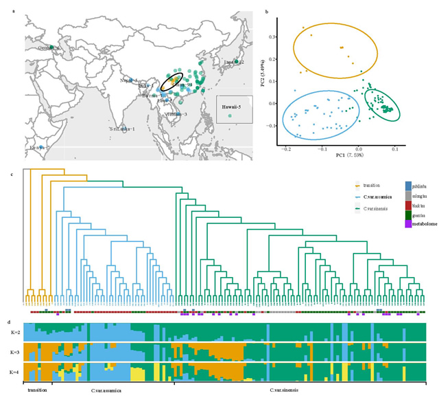 近日,由我所和中國農業科學院深圳農業基因組研究所(以下簡稱基因組所)主導并攜手中國科學院昆明動物研究所(以下簡稱昆明動物所)及云南省農業科學院茶葉研究所等單位,在茶樹全基因組組裝和茶樹起源演化研究上取得重要突破,相關研究成果以“群體測序增強對茶樹進化的認識”(“Population sequencing enhances understanding of tea plant evolution”)為題發表在國際著名期刊《自然通訊》(Nature Communications)上。該研究結果為茶樹基因組學和育種研究,以及茶樹遺傳和進化研究提供了豐富的素材。