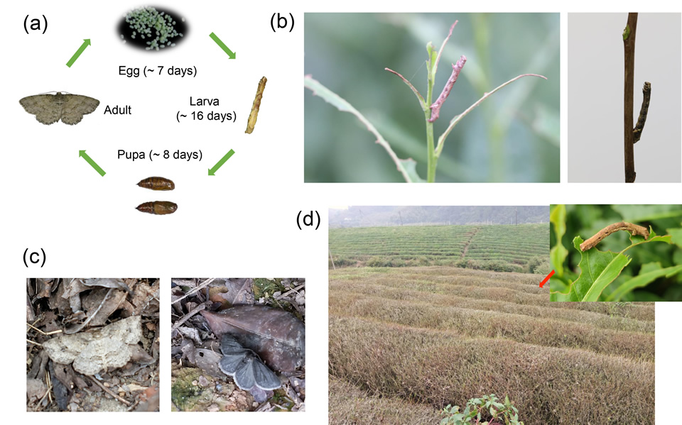 圖1.灰茶尺蠖生活史及生態照(a)灰茶尺蠖生活史(b)灰茶尺蠖幼蟲(c)灰茶尺蠖成蟲(d)灰茶尺蠖田間為害狀