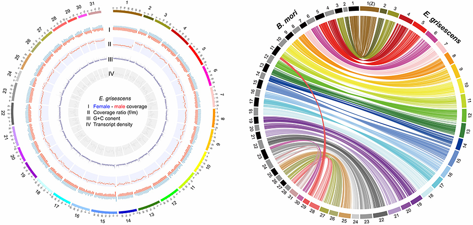 圖2. 灰茶尺蠖染色體水平基因組組裝示意圖(a)灰茶尺蠖基因組在31條染色體上的分布特征(b)灰茶尺蠖與家蠶染色體水平基因組比較
