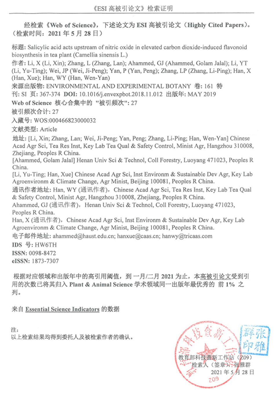 “Salicylic acid acts upstream of nitric oxide in elevated carbon dioxide-induced flavonoid biosynthesis in tea plant(Camellia sinensis L.)”,自2019年在Environmental and Experimental Botany上發(fā)表至今,被引用次數(shù)已達(dá)27次(Web of Science數(shù)據(jù)統(tǒng)計(jì))。韓文炎研究員為該論文的通訊作者。論文揭示了水楊酸和一氧化氮信號(hào)參與了二氧化碳濃度升高環(huán)境下茶樹(shù)類黃酮代謝的調(diào)控,為氣候變化環(huán)境下茶樹(shù)品質(zhì)代謝調(diào)控提供了理論依據(jù)。