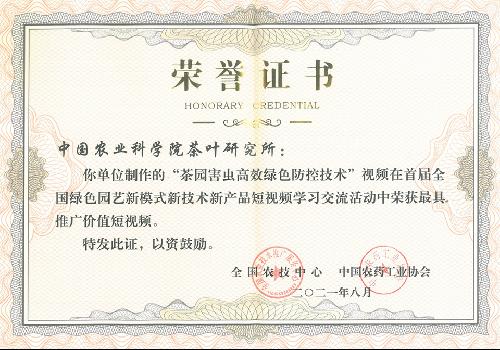 近日,全國農技中心會同中國農藥工業協會聯合舉辦了首屆全國綠色園藝新模式、新技術和新產品(簡稱“三新”)短視頻學習交流活動。我所制作的“茶園害蟲高效綠色防控技術”視頻獲“最具推廣價值短視頻”榮譽稱號。