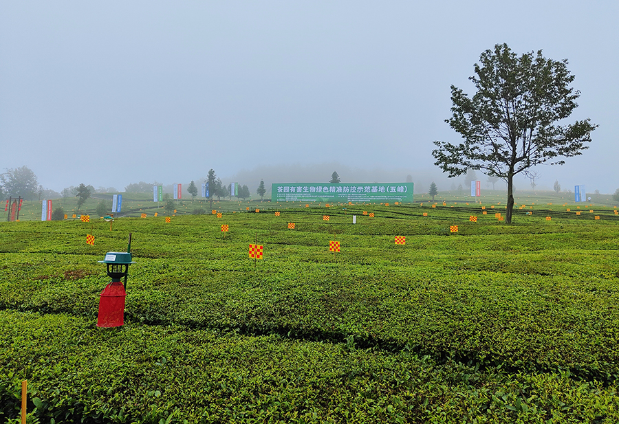30日上午,與會代表來到五峰道家灣茶園有害生物綠色精準防控示范基地現(xiàn)場觀摩學習。技術示范茶園內整齊布置著茶樹害蟲性誘捕器、天敵友好型殺蟲燈、黃紅雙色誘蟲板等裝置,結合高效安全生物農藥,園內害蟲被有效防治,茶樹長勢喜人。