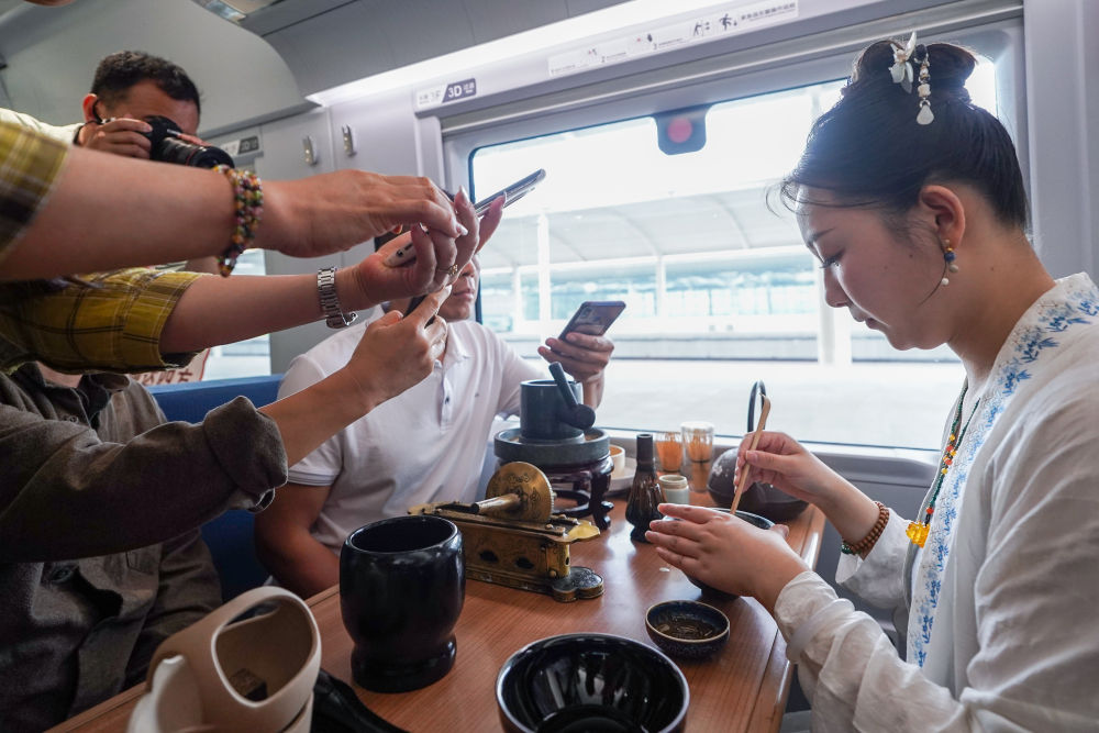 5月20日,南京客運段工作人員(右一)在G2807次高鐵列車車廂內進行茶藝表演。新華社記者 李博 攝