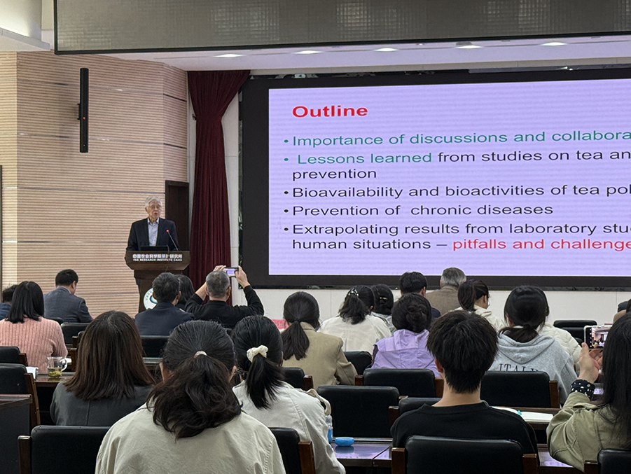 楊中樞教授作了題為“茶葉對健康影響的研究”的學術報告,分享了從茶葉與癌癥預防研究中汲取的經驗教訓,指出茶葉中的多酚類物質具有優異的抗氧化活性,對預防慢性疾病具有重要意義。楊教授提到,將實驗室研究結果應用到人類實際情況時面臨著諸多挑戰,如個體差異、環境因素等。楊教授還強調了討論與合作的重要性,建議青年科技工作者跨學科、跨國界的開展合作與交流。